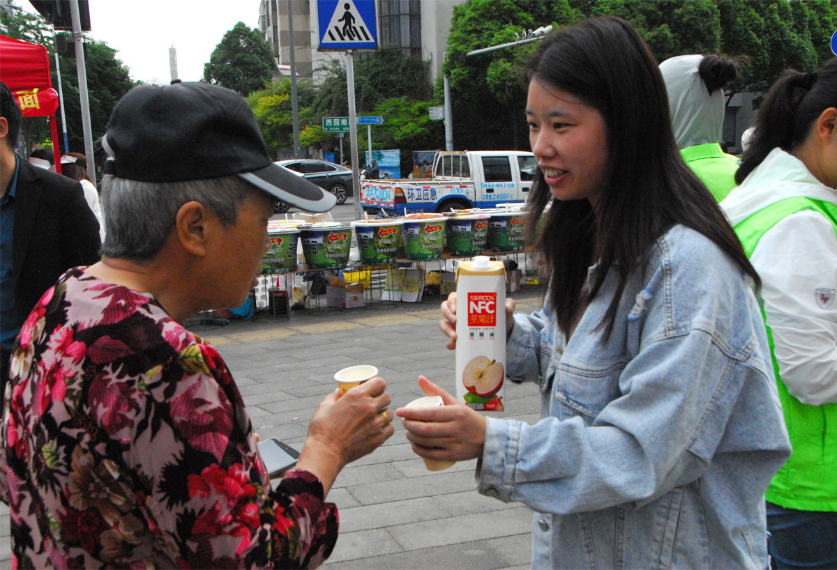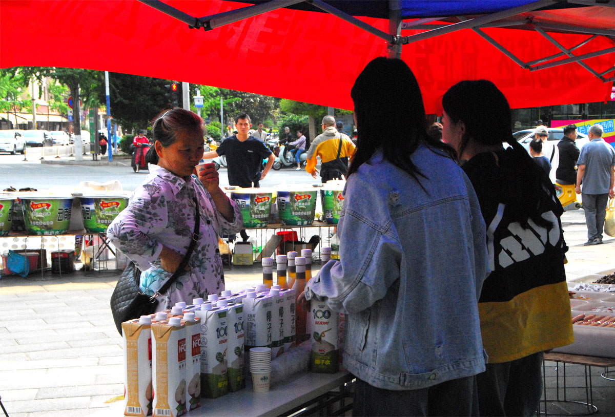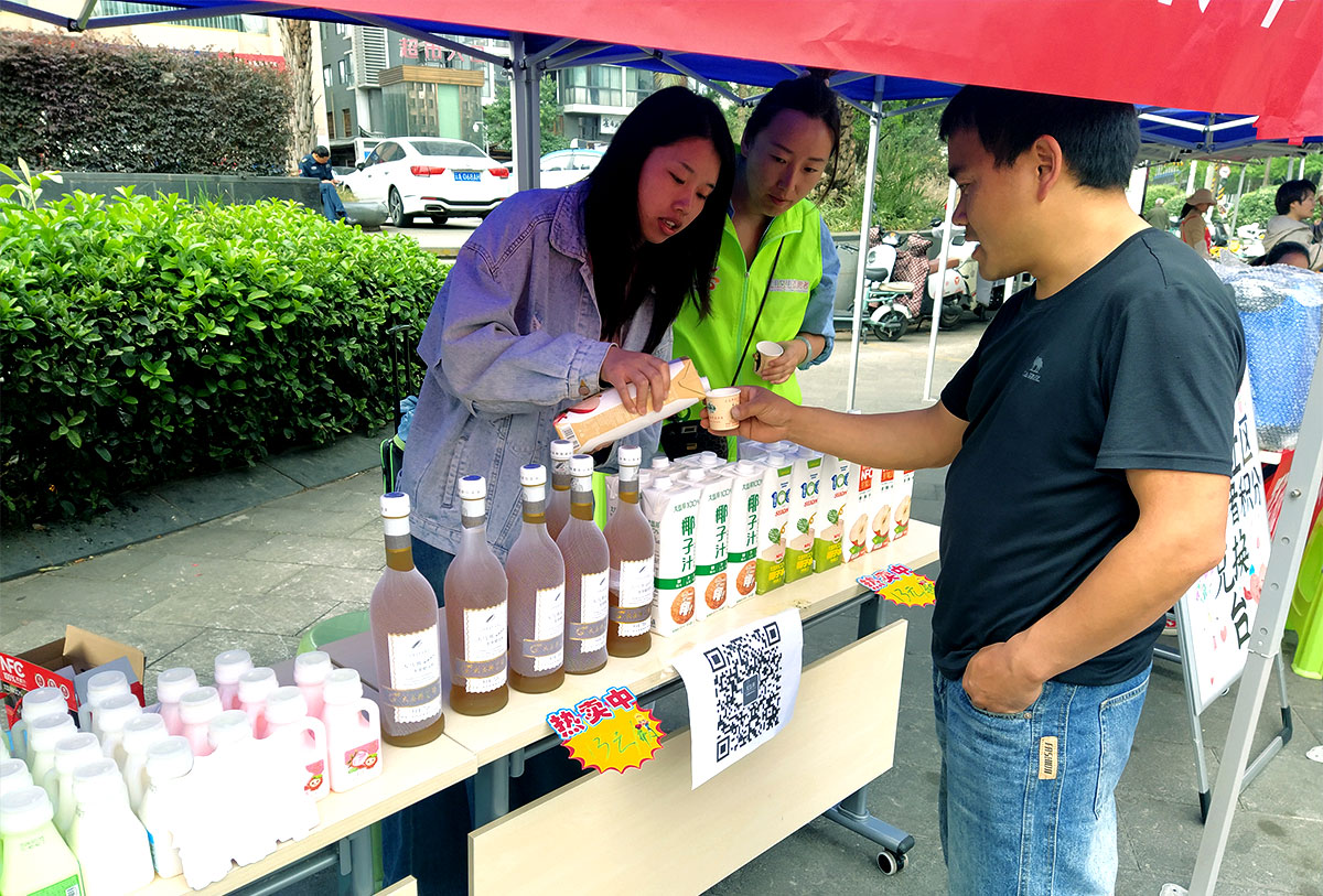 社企共建便民公益集市現(xiàn)場,“大馬邦”展出100%果汁、茶果醋、乳酸菌、桃膠等系列產(chǎn)品,現(xiàn)場熱情邀約廣大居民們試喝。并介紹了不同果汁飲料制作工藝和營養(yǎng)價值,讓居民們了解到健康飲食的重要性。